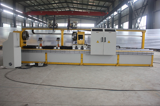 The welding machine adopts horizontal structure, which is mainly composed of headbox, rotary drive motor, pneumatic tailstock, welding gun moving mechanism, welding gun fine-tuning adjustment mechanism, welding gun pneumatic lifting mechanism, electrical control system, etc. The bed supports and connects the whole set of equipment and workpieces. The headbox frame is a box structure, which is annealed after welding with profiles and steel plates, and then finished to ensure the coincidence of headbox and Pneumatic Tailstock. It has the advantages of light weight, high strength, high stiffness and good stability.