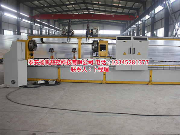 工件裝卡采用軸管中心孔三爪氣動卡盤定位,尾座氣動頂緊方式;工件回轉采用步進電機調速、恒轉矩輸出,速度平穩;機頭橫向和縱向電機采用伺服電機驅動,使用螺旋焊接范圍寬,速度平穩;尾座沿縱向可調,可適應多品種焊接。焊接實施等功能均由控制盒的按鈕實現,操作簡單,便捷,操作采用人機界面可進行參數的更改,參數的修改可通過觸摸式按鍵,方便及時的輸入;該山東焊接專機以松下可編程序控制器為核心組成自動焊接控制系統,自動化程度高,提高工作效率,減少焊接變形。